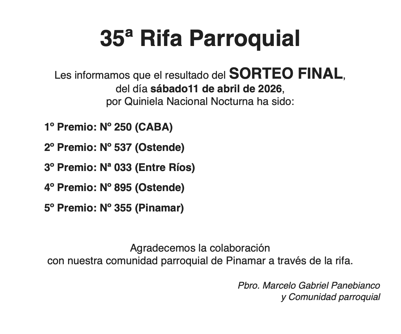 Agradecemos también el ministerio del P. Marcelo y rezamos por su nuevo destino en las Parroquias San José y Santa María de Balcarce y Sagrada Familia de San Agustín.